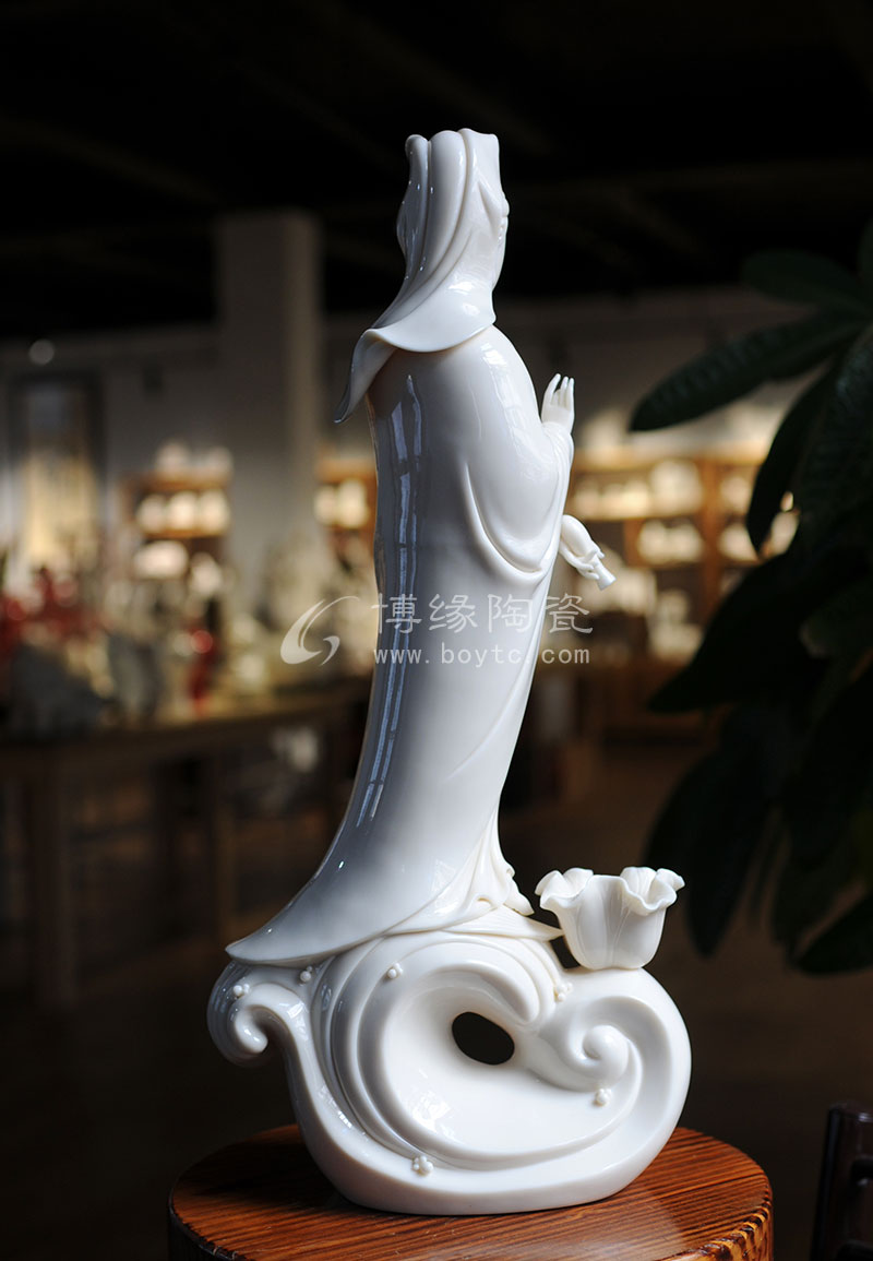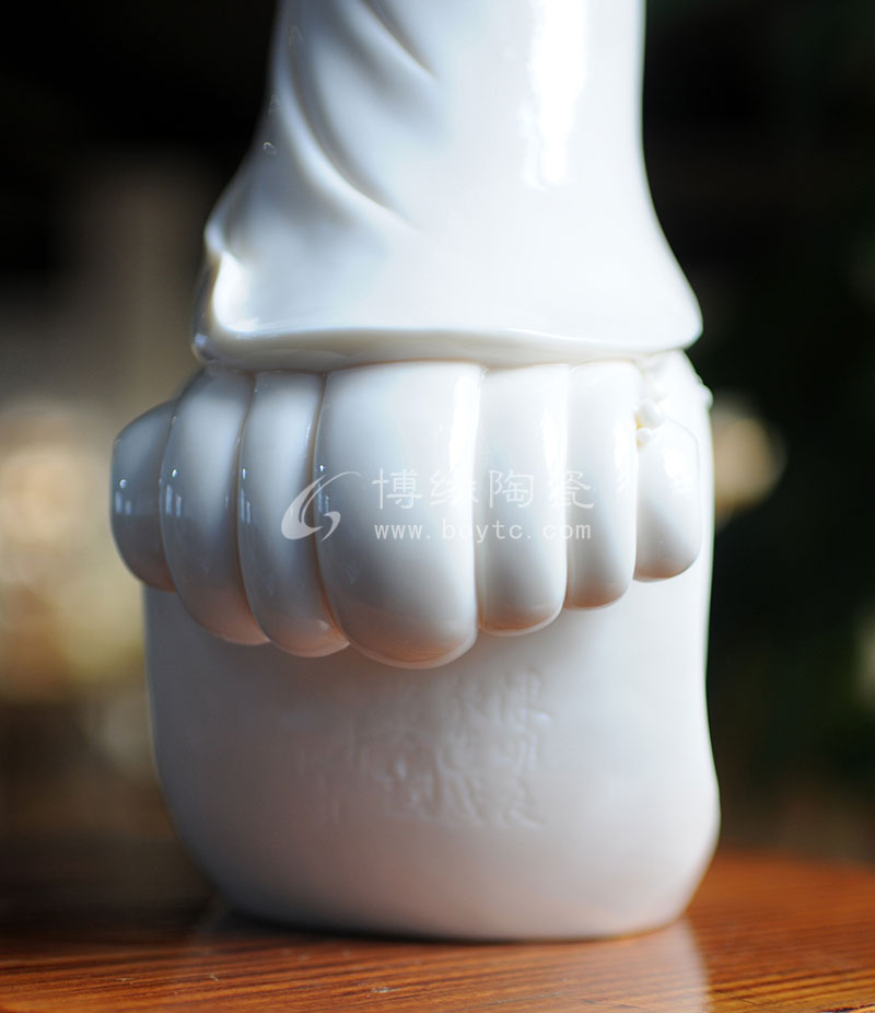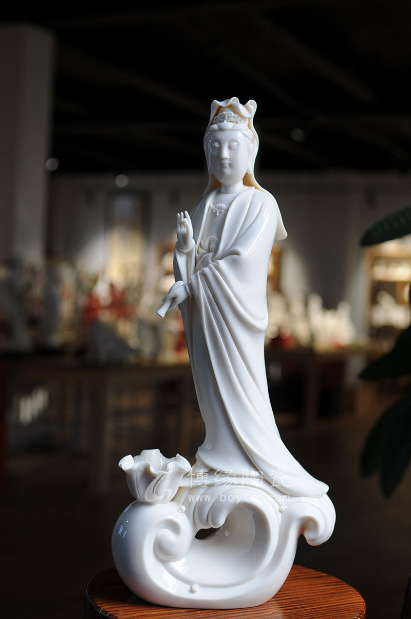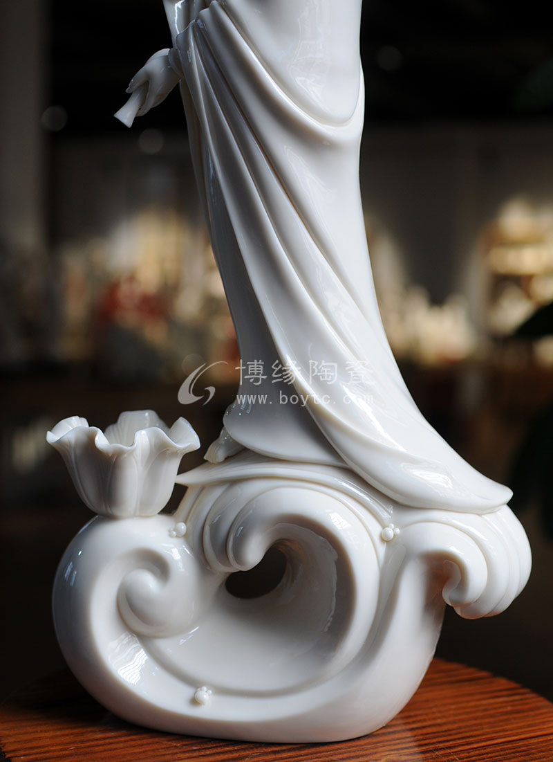 早在明代德化白瓷佛像就名声在外,一代“瓷圣”何朝宗佛像名作流传后世,成为世界各大博物馆收藏的珍品,更对佛像雕塑史上产生深远的影响,形成“何派”雕塑,其开创的捏、塑、雕、刻、刮、削、接、贴八字技法延用至今。何派观音雕塑注重于细节之美,精益求精,故而十分着意衣纹的刻画,使线条流畅,翻转自然。观其佛像,仿佛有春风拂面,衣袂飘扬的出尘之感。