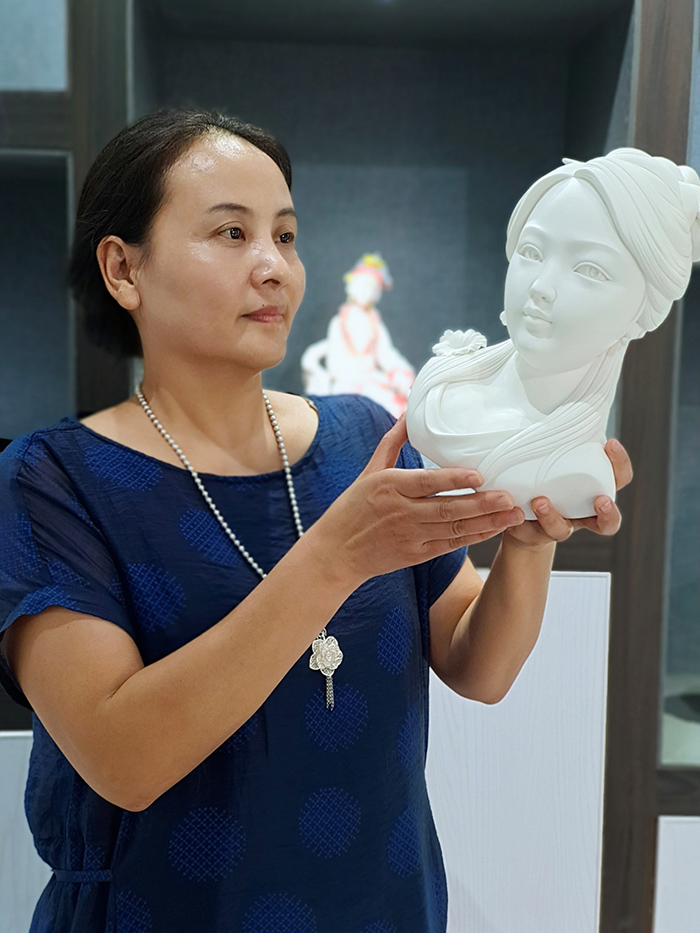德化“陈氏瓷塑”传承人、福建省工艺美术大师陈丽玲在新秀园工作室展示自己的陶瓷作品。张礼珍 摄