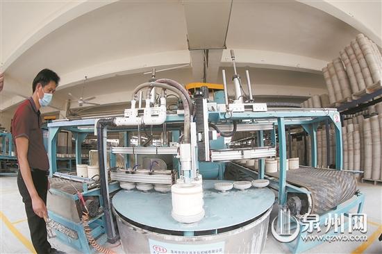 据了解,德化陶瓷高新技术企业由2015年的6家增长到2019年的45家,省级小巨人领军企业58家。同时,该县科技型中小企业的数量也在不断增长,获得2020年科技型中小企业入库编号的陶瓷企业已有26家。为了让企业和各类专业技术人才更加紧密地对接,今年,德化陆续引进中科院上海硅酸盐研究所、清华大学研究生院、陕西科大、南京科大等高校院所进一步开展合作,吸引高端人才把实验室成果移到德化,入驻高科技陶瓷中试研究院,通过“柔性引才”的方式,为企业牵线搭桥。机器换工 从制造迈向“智造”三五秒,一块泥土就滚压成型,10分钟左右,一条自动滚压生产线就完成一个流程……走进德化同鑫陶瓷有限公司的自动化生产车间,几条自动化生产线在三四名工人的操作下不停歇地运转。据悉,该公司主营陶瓷工艺花盆、多肉花盆、欧美节日和家居用品等,产品销往世界30多个国家和地区。该公司行政总监曾俩旺介绍,早年公司生产流程仍是以人工为主,2018年公司率先引进多条自动化生产线,取得不错的效益。
