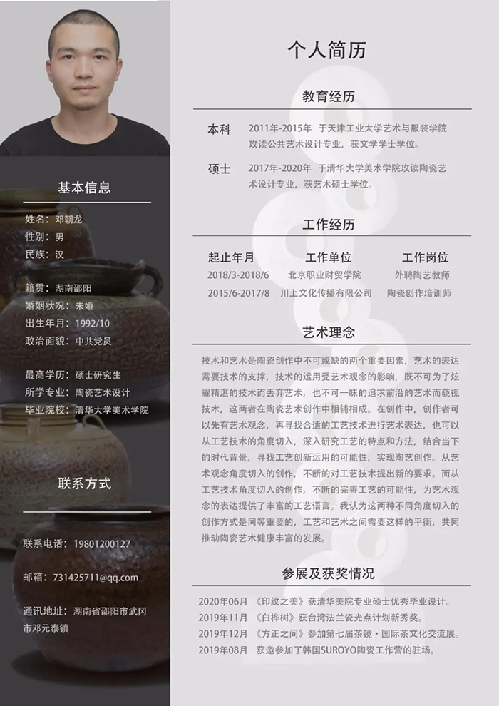 2013年毕业于清华大学美术学院陶瓷系硕士,师从李正安老师;