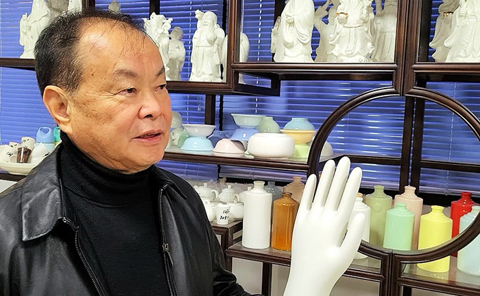疫情让福建省玉瓷发展股份有限公司董事长温克仁找到了新商机。在他的办公室里,记者看到桌上和地上摆放着好几个陶瓷手模。