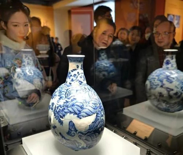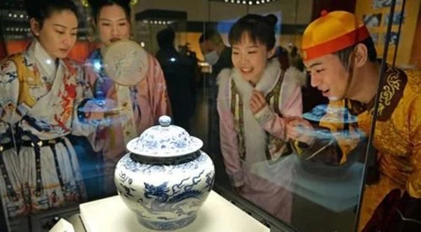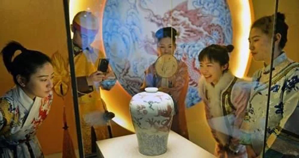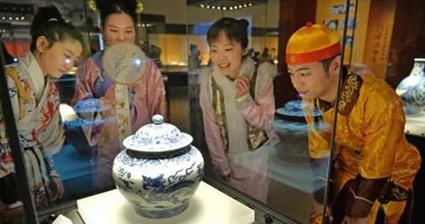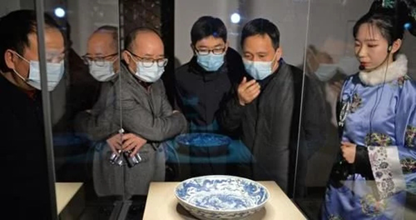 12月28日,身着古装的工作人员在观看瓷器特展。当天,“龙翔九天——元明清御用瓷器特展”在长沙博物馆开幕,本次特展共遴选元明清御用瓷器128件(套)。展览免费开放至2021年3月28日。 湖南日报记者 李健 摄