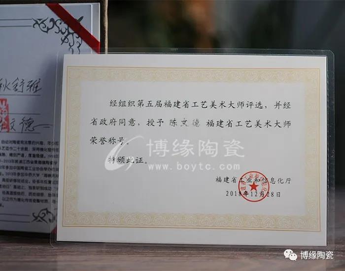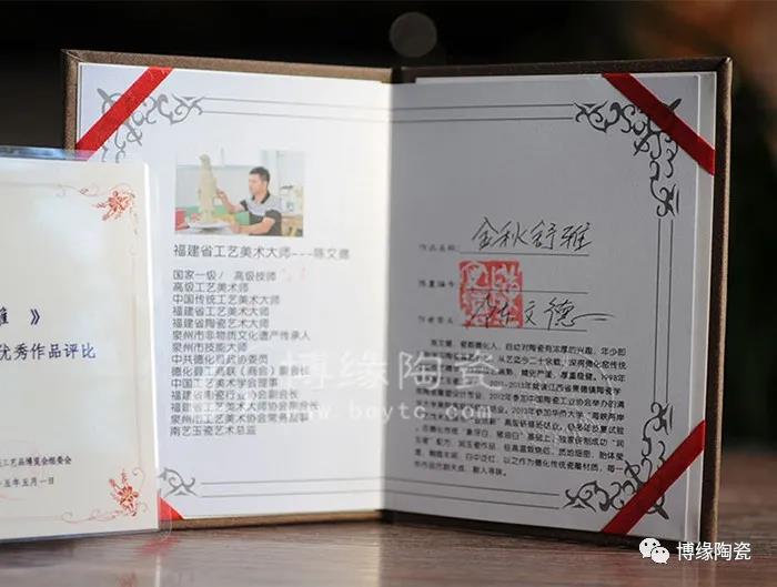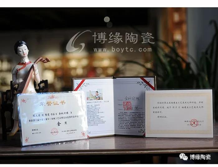 《金秋舒雅》由福建省工艺美术大师 陈文德手工制作,以白瓷为胎底,手工绘彩二次高温烧制。作品精细典雅,人物头饰以手工瓷花做为装饰使作品更具精细感。