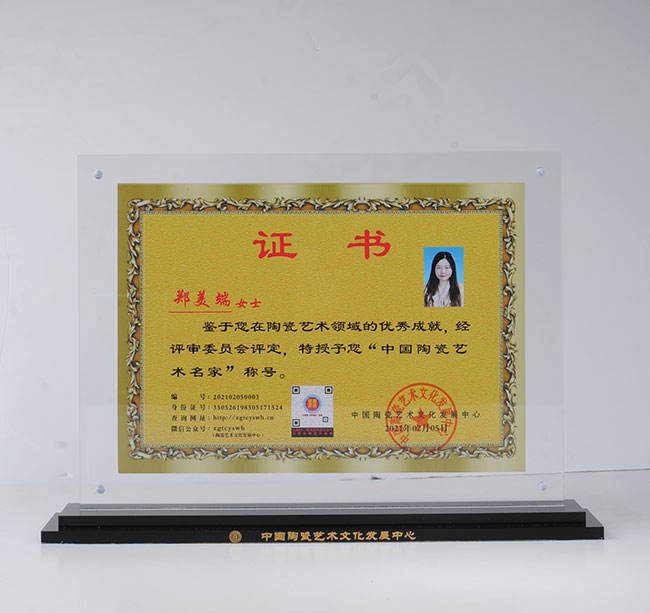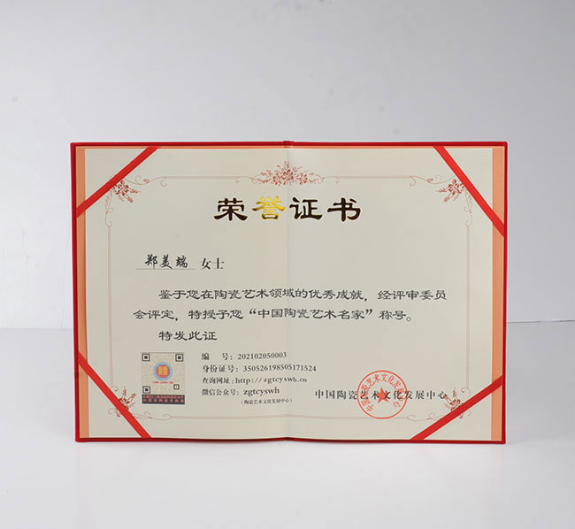 郑美端,女,汉族,1985年5月出生,大专学历,中国陶瓷艺术名家、中国陶瓷艺术文化发展中心会员、福建省德化博雅陶瓷有限公司担任艺术总监。