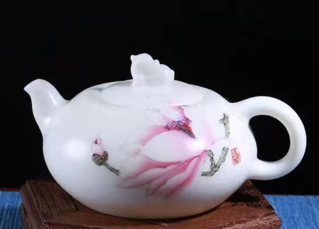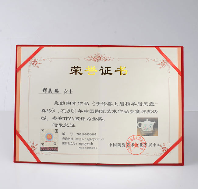 作品《手绘喜上梅梢羊脂玉瓷壶》荣获金奖