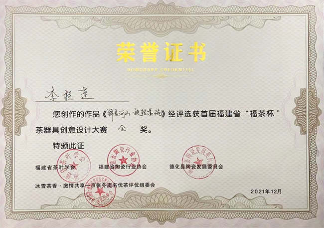 作品《锦秀河山 旋转盖碗》荣获2021年福茶杯茶器创意设计大赛金奖。