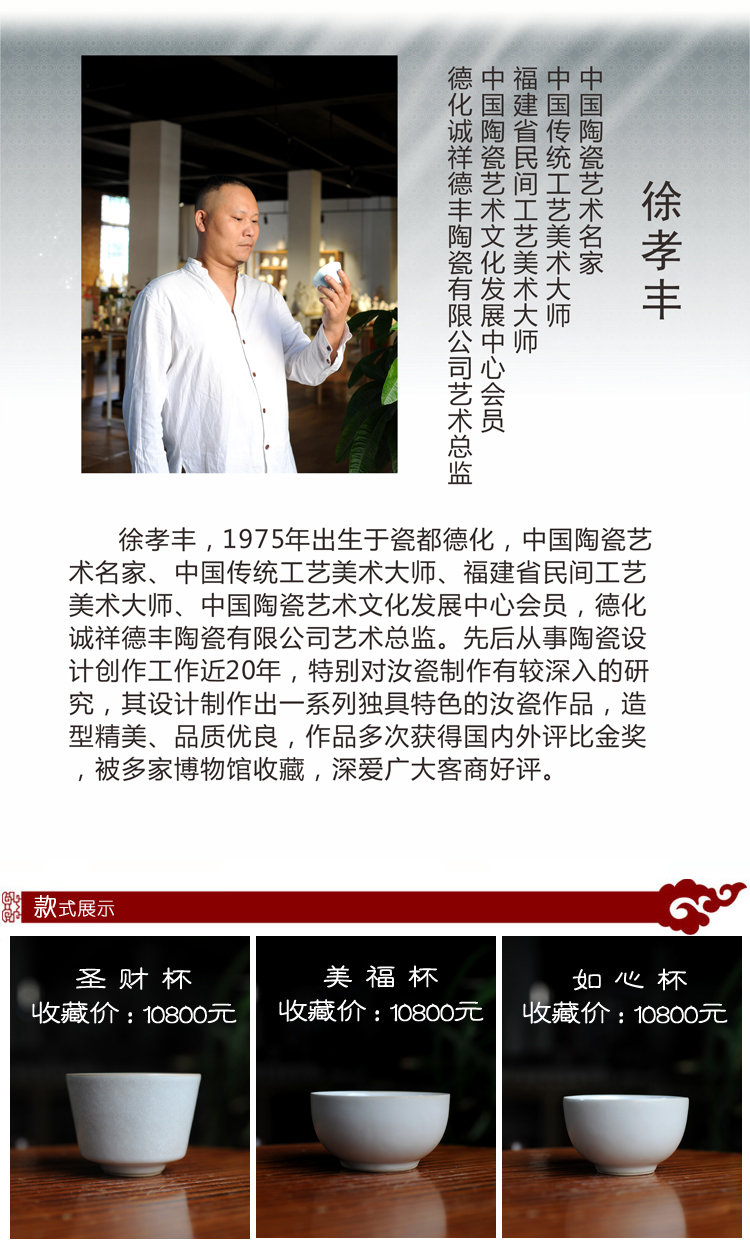 徐孝丰,在瓷都德化的一个陶瓷世家,从小成长在瓷都德化,深受瓷都德化千年陶瓷文化熏陶,对陶瓷产生浓厚的兴趣,大学毕业后,1998-2005 在德化第一瓷厂从事学徒及烧制,2006-2014 在德化瓷厂从事陶瓷制作工作 ,2015创办名古丰陶瓷有限公司并兼艺术总监,并主要从事汝瓷作品开发创作。 收藏版润彩汝窑作品: