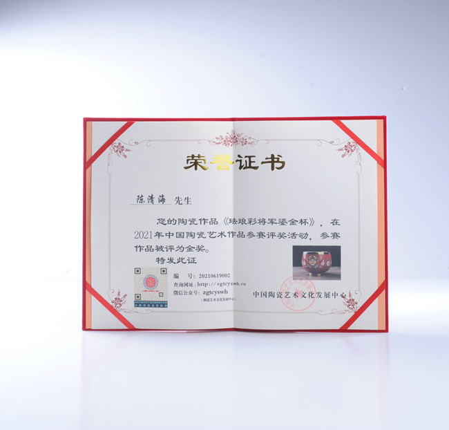 作品《珐琅彩将军鎏金杯》荣获2021年中国(北京)陶瓷艺术家作品评比金奖。