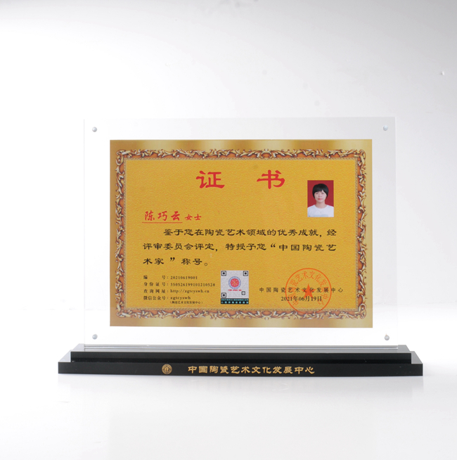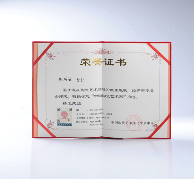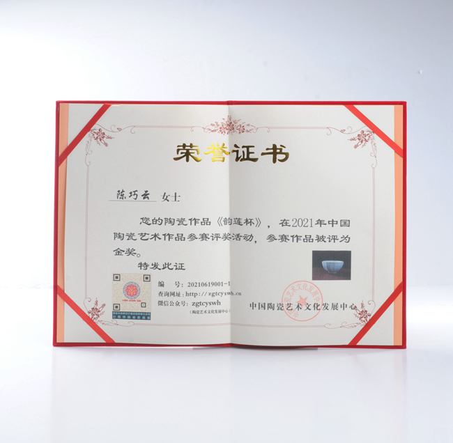 陈巧云从小深受千年瓷都德化陶瓷文化熏陶,对德化陶瓷便有浓厚的兴趣,毕业后便回到瓷都德化深入学习德化白瓷茶具、汝瓷设计、釉水配方、烧制,期间还到龙泉等产区“取经”学习交流,经过多年的积累,其熟练掌握白瓷、汝瓷、青瓷的配釉、烧制。2019年成立福建省德化掌中瓷陶瓷有限公司,并开发出一系列作品,作品深受广大客商喜爱,多件作品荣获各评比金奖,作品《韵莲杯》荣获2021中国陶瓷艺术名家作品评比金奖,《禅定杯》荣获2021中国陶瓷艺术名家作品评比金奖,2021年被中国陶瓷艺术文化发展中心评选为“中国陶瓷艺术家”。