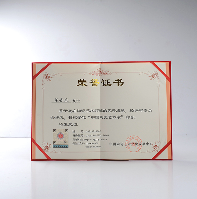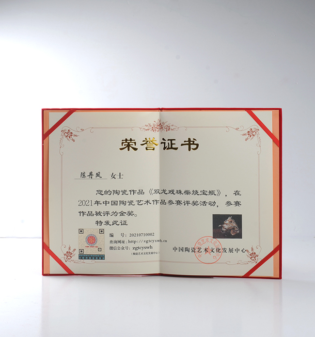 经过多年的积累,陈丹凤创作出一系列优秀作品,其作品深受广大收藏爱好者喜爱,多件作品荣获各评比金奖,作品《双龙戏珠柴烧宝瓶》荣获2021中国陶瓷艺术名家作品评比金奖等,2021年被中国陶瓷艺术文化发展中心评选为“中国陶瓷艺术家”。