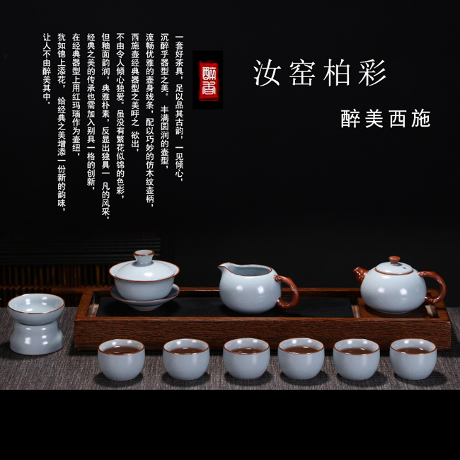 一套好茶具,足以品其古韵,一见倾心,沉醉乎器型之美。 丰满圆润的壶型,流畅优雅的壶身线条,配以巧妙的仿木纹壶柄,西施壶经典器型之美呼之 欲出,不由令人倾心独爱。虽没有繁花似锦的色彩,但釉面韵润,典雅朴素,反显出独具一 凡的风采。 经典之美的传承也需加入别具一格的创新,在经典器型上用红玛瑙作为壶纽,犹如锦上添花, 给经典之美增添一份新的韵味,让人不由醉美其中。