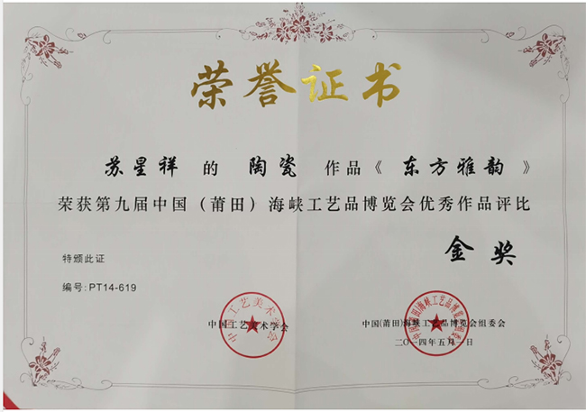 2014年《东方雅韵》获第九届(莆田)海峡工艺品博览会金奖。
