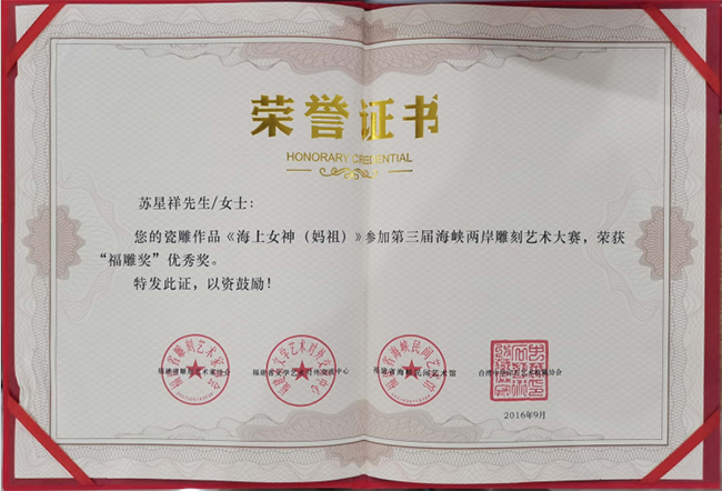 2016年《海上女神(妈祖)》获第三届海峡两岸雕刻艺术大赛“福雕奖”。