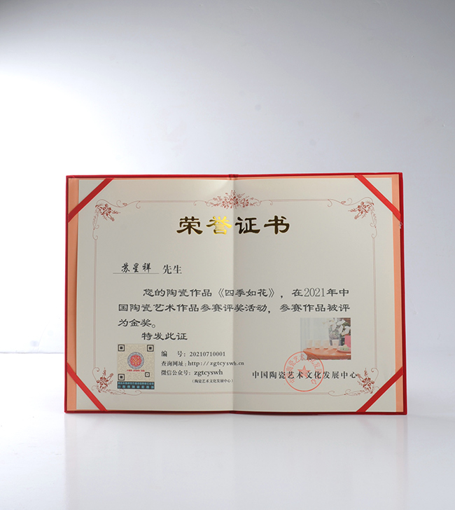 2021年作品《四季如花》获荣2021年北京中国陶瓷艺术名家作品展金奖。