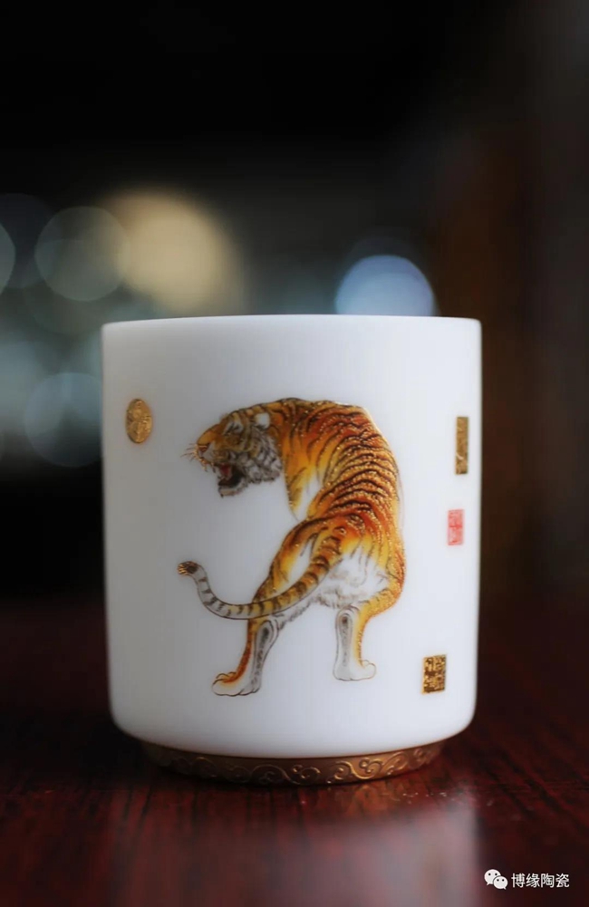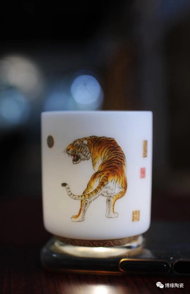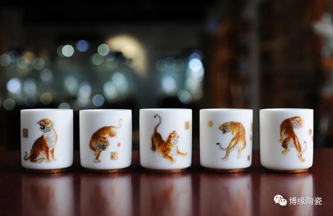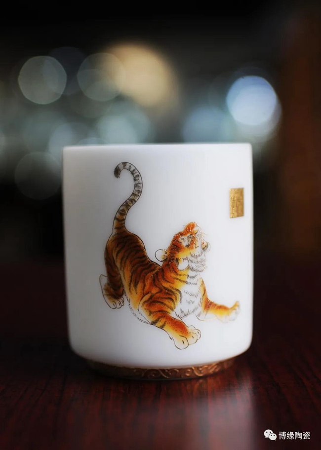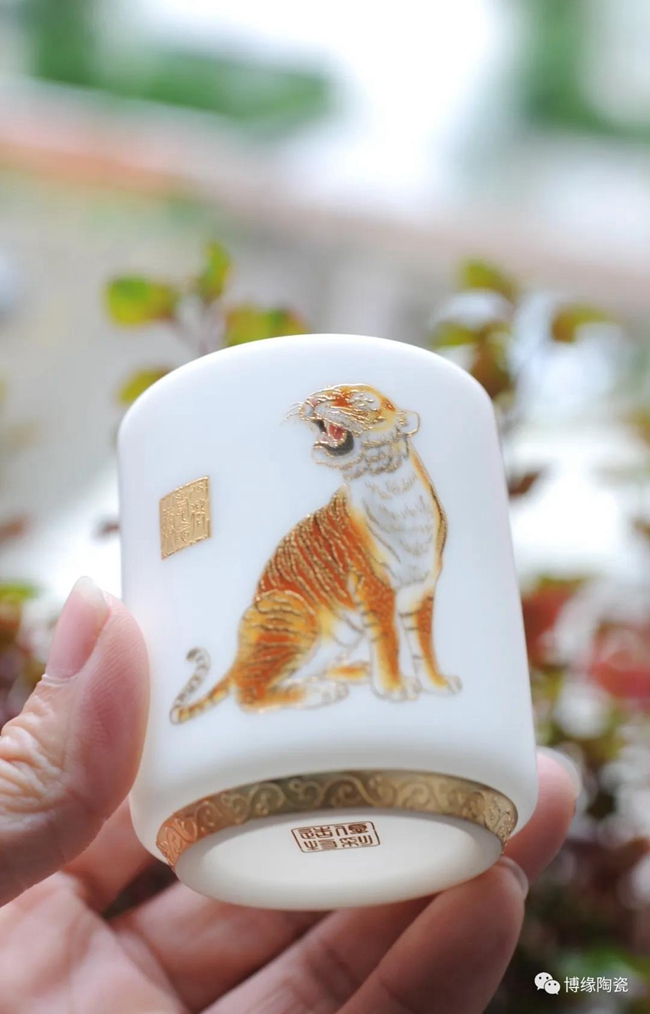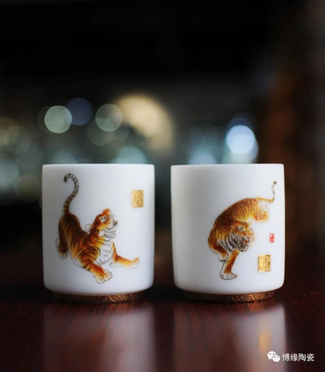 在2022年虎年来临之际,博缘陶瓷特推出“五福(虎)临门”羊脂玉瓷杯,五福:第一福"长寿"、第二福"富贵"、第三福"康宁"、第四福"好德"、第五福"善终"。也有人简称为寿富康德善。每款杯子采用不同造型的虎图案,栩栩如生,灵活灵现,采用高清堆料花纸工艺,手工描金,使作品更具尊贵,作品采用30000多元/每吨瓷泥1300多度高温烧制,瓷胎薄润如玉,具有较高的鉴赏价值。