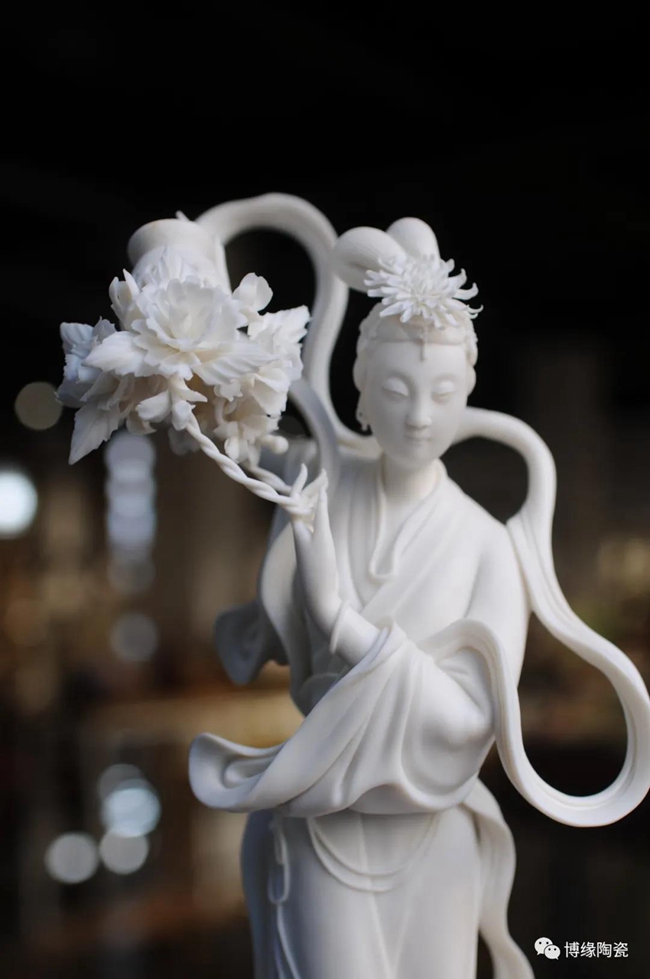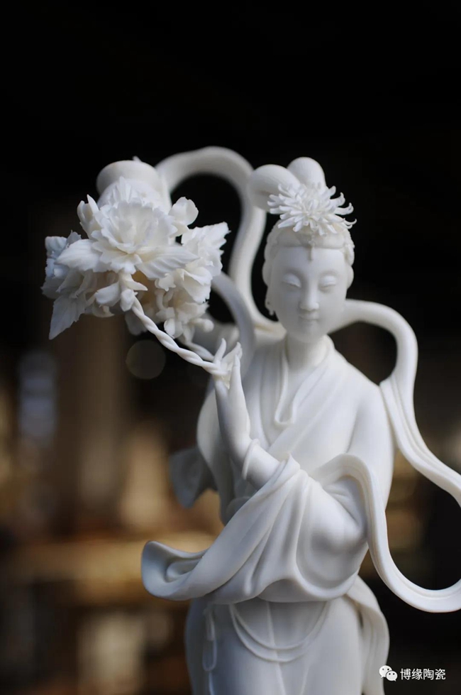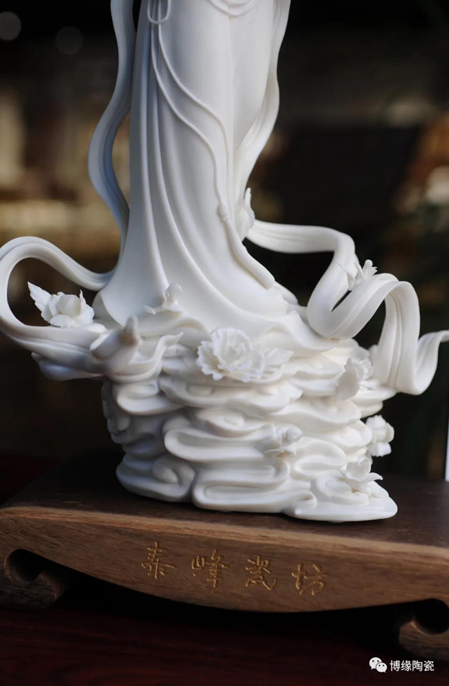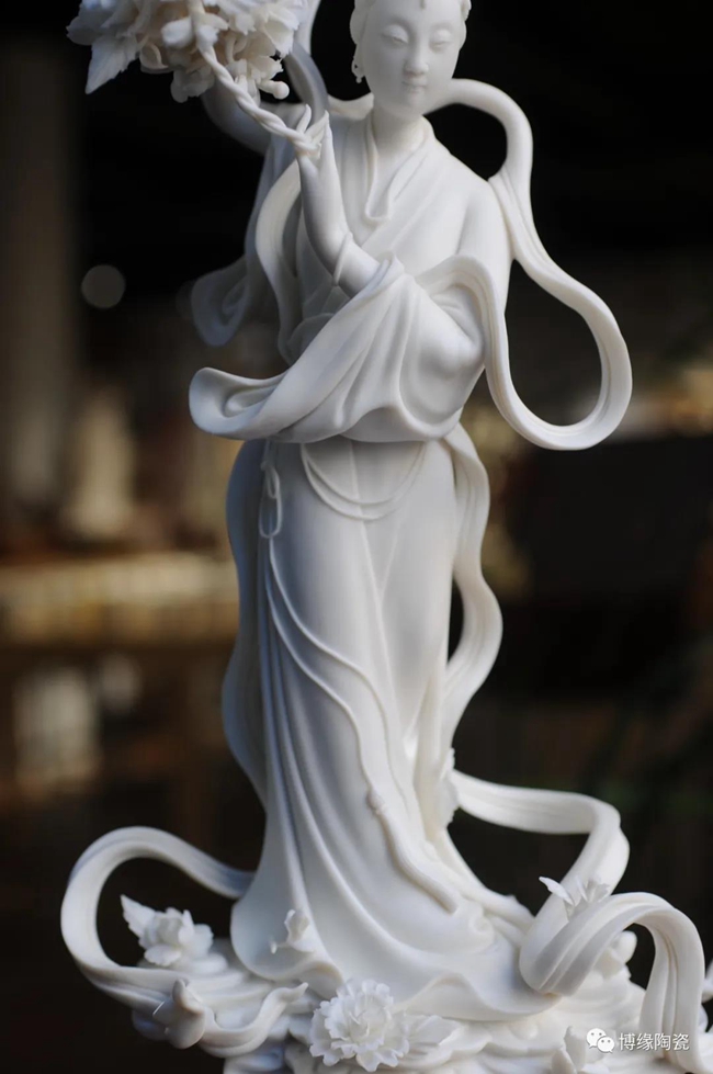 德化是“中国白的故乡”,在世界瓷坛独树一帜,被称为“世界白瓷之母”,德化白瓷温润、明净、典雅、精巧,被称“象牙白”、“鹅绒白”,素有“世界白瓷看中国,中国白瓷看德化”之称。早在明代德化白瓷就名声在外,一代“瓷圣”何朝宗名作流传后世,成为世界各大博物馆收藏的珍品,更对雕塑史上产生深远的影响,形成“何派”雕塑,其开创的捏、塑、雕、刻、刮、削、接、贴八字技法延用至今。何派雕塑注重于细节之美,精益求精,故而十分着意衣纹的刻画,使线条流畅,翻转自然。观其作品仿佛有春风拂面,衣袂飘扬的出尘之感。