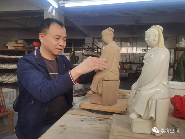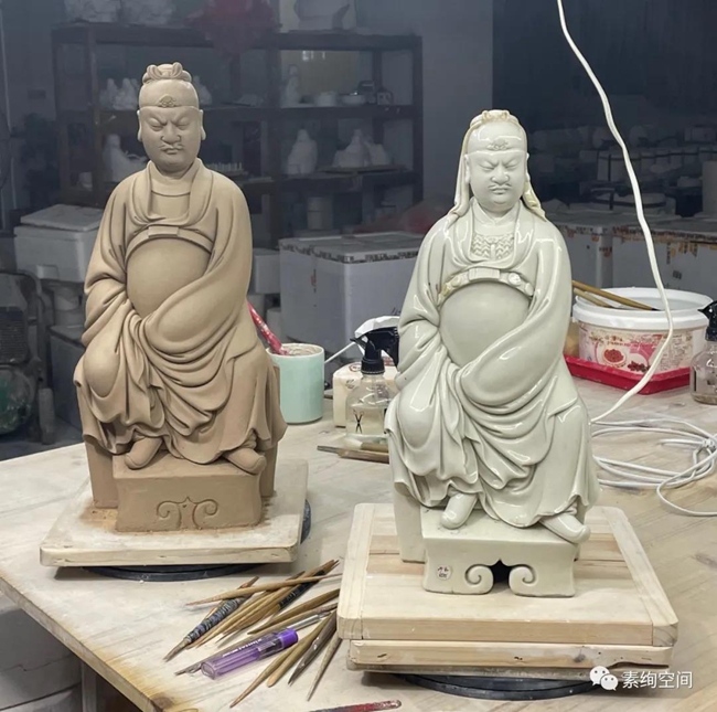 2020年9月,早已打下坚实技艺基础的郑雄伟终于决定敬摹明代“瓷圣”何朝宗关帝圣君像。他与福建省陶瓷艺术大师陈良瑜、福建省工艺美术名人郭爱珠一起组建了“合德堂”团队,秉承“德合天地,艺承古今”的理念,着手敬摹。他们首先深入查找关公的相关资料,了解人物的背景、特征、故事以及文化内涵,对关公的形象有了更准确和深刻的把握。因为有实物可观,他们对照原作,用心地观摩和研究每一个部位每一个细节,包括卧蚕眉形的角度,嘴角的弧度,衣纹的走向和线条数量,腹部高度,甚至头顶罩巾的结、耳廓的构造等等,全部都做到与何朝宗原作一致。“其实最难摹仿的还是神韵。那种看不见的张力、感觉与气质,只能依靠感悟。”郑雄伟说。白天比较喧闹,杂事也多,他们三人就常常在深夜一起讨论、交流、研究,有时候通宵达旦,思想碰撞迸发创作灵感,数易其稿,最终才达到自己满意的效果。创作过程中,他们经常邀请前辈、专家、同行前往观看指导,积极吸收、听取大家的意见,很多人表示临摹得非常好了的时候,他们依旧不敢懈怠,不甚满意,其中单单一个头部就做出了数十个,始终不断地比较、甄选和改进。“我也有一定年纪了,就不去考虑成本了,一年只做这一件,只想做出好作品可以流传下来。何朝宗这尊作品被我收藏,我也不能辜负了它。”郑雄伟认真说道。