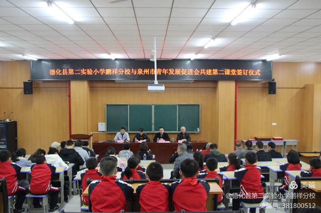本学期,根据课后服务工作的需要,为了开阔学生视野,提高学生的综合实践能力,提升学生的艺术审美情趣,传承德化传统陶瓷技艺和文化,从小培养学生知瓷、爱瓷、爱家乡的意识,更好地形成文化遗产的有序传承,搭建青少年培训、活动、教育和展示的平台。11月24日下午,二实小鹏祥分校与泉州市青年发展促进会举行共建第二课堂签订仪式。出席本次活动的有泉州市青年发展促进会会员,学校领导、老师和部分学生代表近300人。签订仪式由连副校长主持。