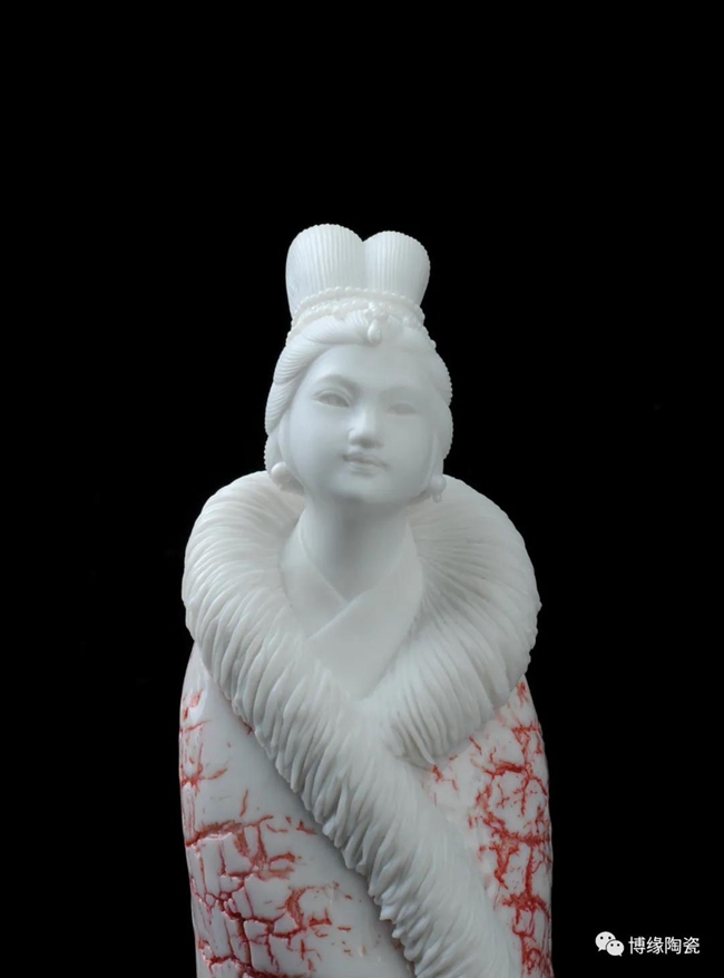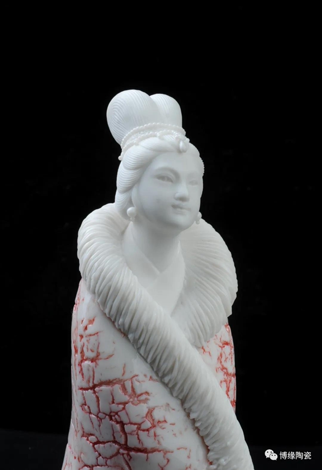 《咏梅》是当代著名陶瓷大师,中国工艺美术大师——柯宏荣、陈桂玉夫妇创作的作品。作品以德化白瓷为胎质,以写意雕塑手法,见女子身披粉色雪狐棉衣,坐于茫茫雪花之中,一手持梅花,头微微上仰,仿佛沉醉于梅花花海之中,作品头饰、衣饰、发丝、梅花纯手工雕刻,所到之处无不精细赞叹,足见大师在创作时的独运匠心,作品底部有中国工艺美术大师柯宏荣、陈桂玉夫妇手刻签名,是一件不可多得的收藏精品。
