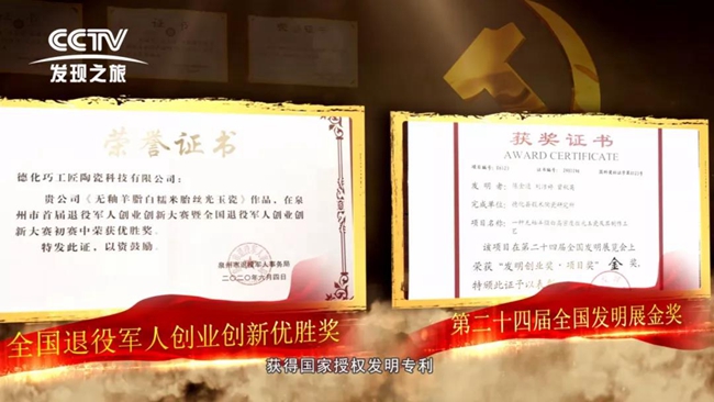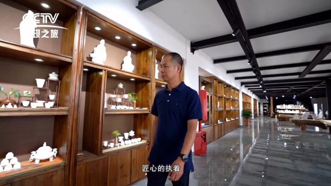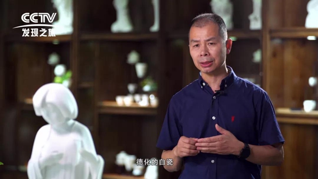 “德化的白瓷,不是像纸张一样白,也不是像雪花一样白,而是我们德化白瓷的一个特色,最大的特色是白中有点带黄。”陈金通介绍道。陈金通退伍后师从中国陶瓷艺术大师、中国工艺美术终身成就奖获得者、国家级非物质文化遗产项目德化瓷烧制技艺代表性传承人邱双炯。作为高级工艺美术师、国家一级(高级)技师,陈金通在传承德化白瓷的传统烧制技艺的同时,还执着地探索很多具有创新性的技艺,先后研发出了中国红釉(冠福红)、窑变结晶釉。