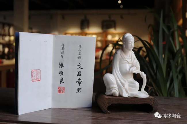 作品《文昌帝君》由中国工艺美术大师陈明良创作,作品长12.5宽 14 高30.5 cm(含底坐4.5cm),采用德化优质高岭土,经1300多度高温烧制,瓷胎温润似玉透光线强。作品传承明代何派技法,以熟练的雕塑技巧和丰富的生活体验,赋予文昌以鲜活的生命,使之更加世俗化、生活化,具有超凡脱俗之轩昂器宇,洋溢着感人的艺术魅力。文昌衣纹刻划线条深秀,简洁潇洒,柔和流畅。文昌帝君头戴唐巾(又称进士冠),两巾角缚于后分垂颈肩;国字形脸庞,丹凤眼,大耳;身穿宽袖长袍,一手执玉书卷,一手藏自于衣袍之中。整件瓷雕胎白,坚实厚重,质感莹润。背部落有中国工艺美术大师陈明良款识及手刻签名,该作品被多国总统收藏,是一件集鉴赏收藏为体的佳作。