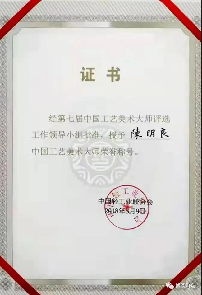 陈明良,中国工艺美术大师,中国陶瓷艺术大师,享受国务院特殊律贴,第五批国家非物质文化遗产《德化瓷烧制技艺》代表性传承人,国家一级技师,高级工艺美术师,职业艺术品鉴定师,福建省工艺美术大师,中国陶瓷工业协会常务理事,福建省古玩工艺协会常务副会长,德化县收藏家协会会长,泉州工艺美术职业学院客座教授,泉州市特色专业领军人才,德化县明玉陶瓷研究所艺术总监。
