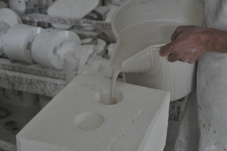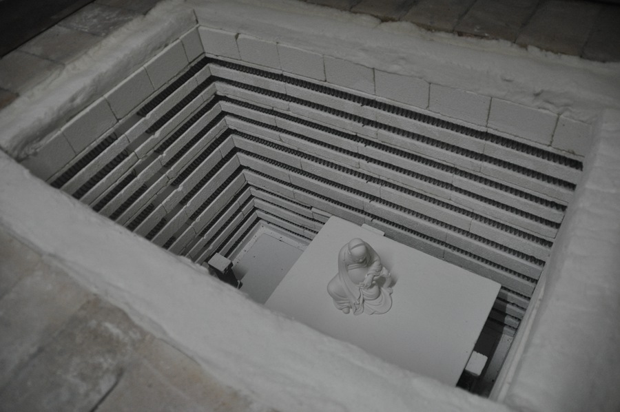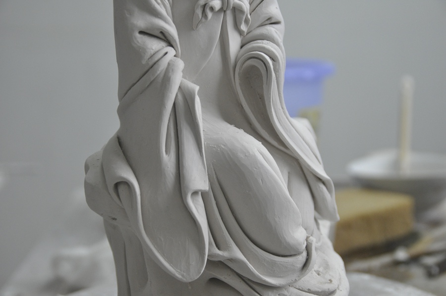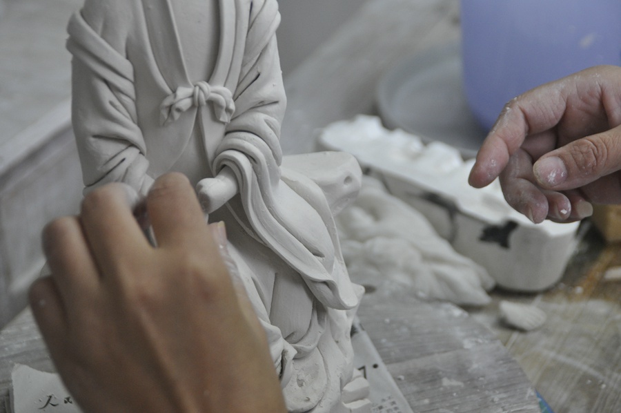 德化瓷烧制技艺可分为瓷土加工、雕塑成型、烧成三个过程。德化瓷烧制技艺国家级传承人陈明良介绍,陶瓷雕塑综合石刻、木雕、泥塑的技法特点,采用“捏、塑、雕、刻、刮、削、接、贴”八字技法,雕塑成型,然后放入窑中在一千多度的高温下烧制而成。其中,成型技艺有两种,一种是选用优质的高岭土直接塑造成型,一种是将泥塑翻制模具后再注浆或拓印成型,干后根据需要决定是否上釉。雕塑成型工艺,以模制为主,兼有少量捏制。