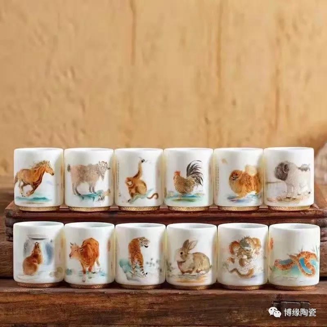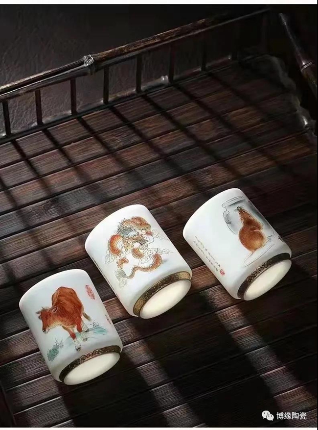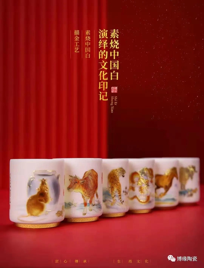 在2022年新年来临之际,博缘陶瓷特推出“中国印记十二生肖”羊脂玉瓷杯,十二生肖,又叫属相,是中国与十二地支相配以人出生年份的十二种动物,即子(鼠)、丑(牛)、寅(虎)、卯(兔)、辰(龙)、巳(蛇)、午(马)、未(羊)、申(猴)、酉(鸡)、戌(狗)、亥(猪),随着历史的发展逐渐融合到相生相克的民间信仰观念。此作品描绘栩栩如生,灵活灵现,采用堆料花纸工艺,品质高,品相好,手工描金,使作品更具尊贵气质,作品采用30000多元/每吨瓷泥1300多度高温烧制,瓷胎薄润如玉,玲珑透光,具有较高的实用和鉴赏价值。