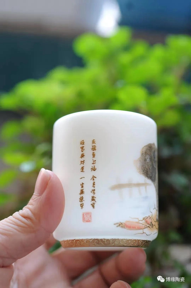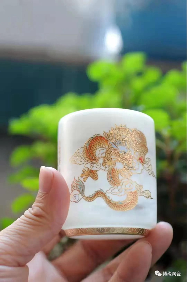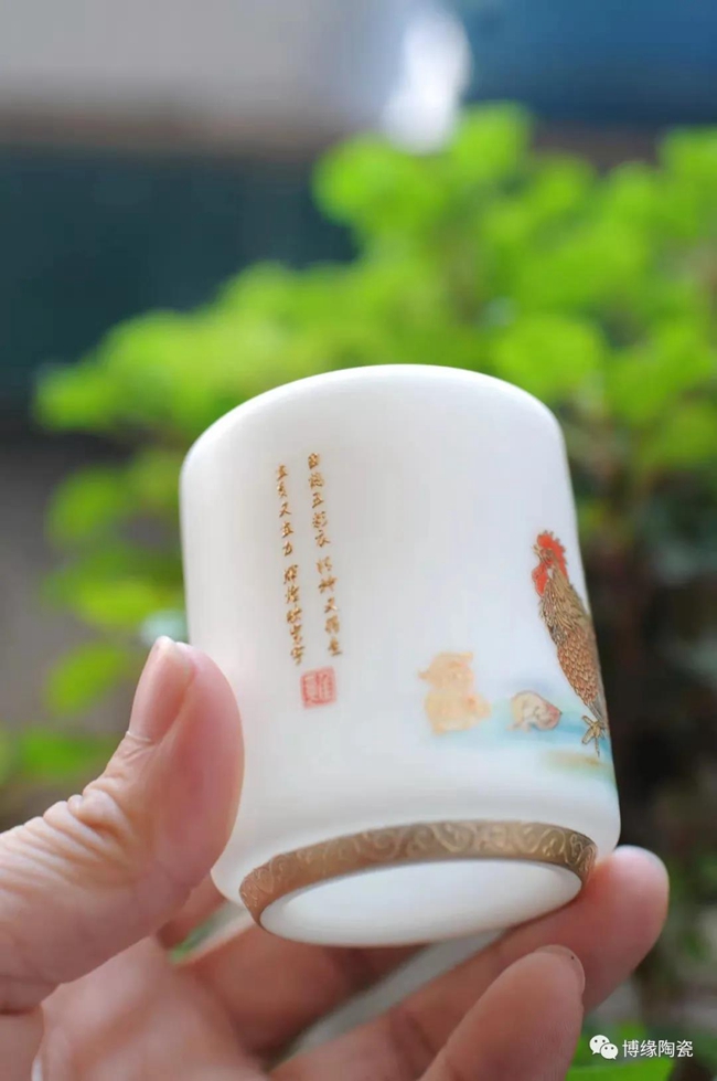 杯底圈足描金,手绘图案精美,半立体纹路,触感丰富,杯体白而透光,质感温润洁白, 衬托茶色之佳品。