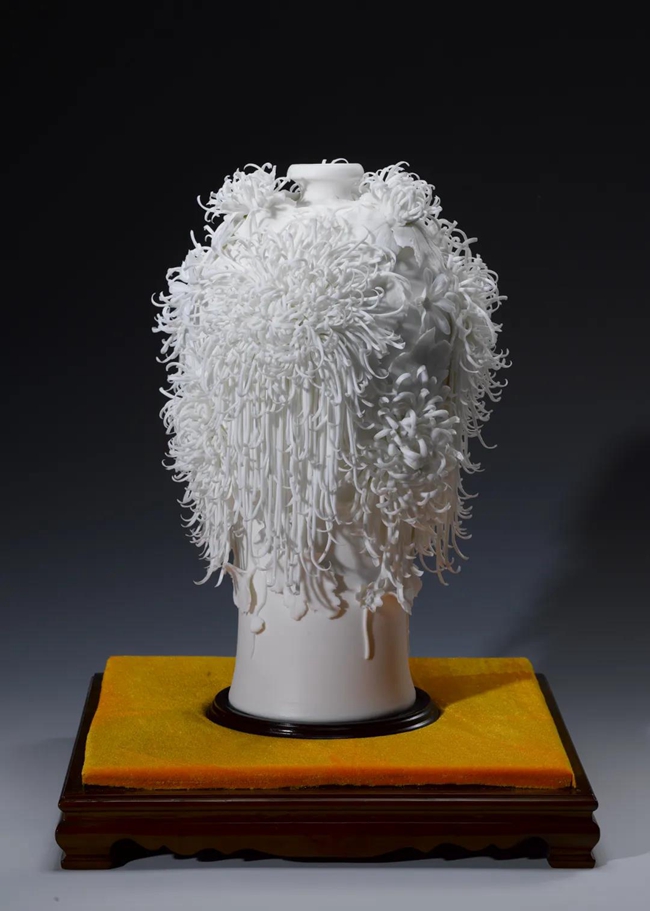 这件吉祥花瓶将巧夺天工的匠心技艺与德化白瓷“坚韧、莹厚、细腻、温润”的特点完美结合在一起,瓶身没有彩绘,也没有雕刻,只是瓶身主体部分上,设置了立体的菊花。令人拍案称奇的地方在于,莹白如玉的菊花瓣如丝一般立体细致地镶嵌在瓶身上,白色的素朴映带着极致的绚烂,令人眼花缭乱。为了烧制出理想的菊花瓣,赖礼同需要先一根根做成花丝状,等湿度适合的时候放上去,太干会断,太湿无法固定造型。经过他无数遍的失败与尝试,最终才淬炼出被故宫专家称之为绝活的这件吉祥花瓶。
