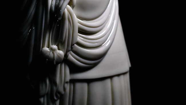 我们惊喜地发现,在这件作品中,璋高把传统德化瓷雕中对人物衣襟细节处理的方法,即“曹衣出水”般丝质的感观与何派“褒衣博带”圆润含蓄的中原文化风格的结合,在这件作品的下半部分的裙裾处表现得酣畅淋漓。