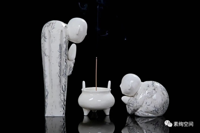 《诚心诚意线香炉》这组作品是场景式的组合呈现。正中一纯净无瑕、洁白如玉的三足炉,燃着的线香插于其中,左右两个夸张写意化的小弥陀,一站一跪,十分可爱,却营造出悠远的禅意来。