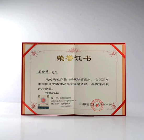 《冰花汝窑壶》荣获2022年中国陶瓷艺术作品评比金奖