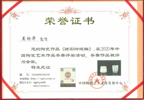 2011年吴伦华来到世界陶瓷之都德化并创办吴伦华制釉厂,经过20多年科研与实践,吴伦华在陶瓷仿古釉、窑变釉、汝窑等釉见解独到、推陈出新,公司成立以来,重视团队协作,注重研发,所研发产品深受陶瓷企业、工艺美术大师喜爱,其产品远销国内外及各陶瓷产区,2020年开发出“眩彩玲珑釉”并荣获2020年中国(北京)陶瓷艺术作品展金奖。2022年作品《冰花汝窑壶》荣获中国陶瓷艺术作品评比金奖。“入窑一色,出窑万彩”正是颜色釉特点的最好写照,吴伦华凭借20多年研发在陶瓷制釉领域不断领先,并在世界瓷都德化缔造晶窑,产品燦灿中外。
