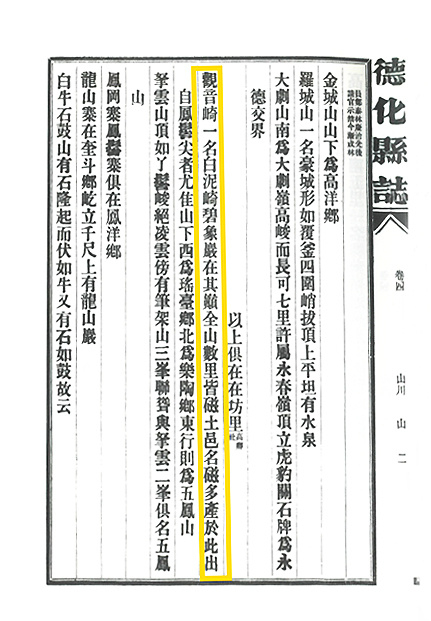 德化地处“闽中屋脊”戴云山脉腹地,高岭土质优量多。据民国《德化县志》记载:“观音崎,一名白泥崎,碧像岩在其巅,全山数里皆瓷土,邑名瓷多产于此。”