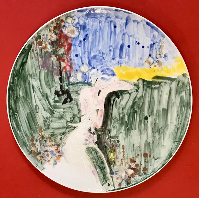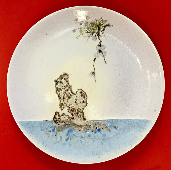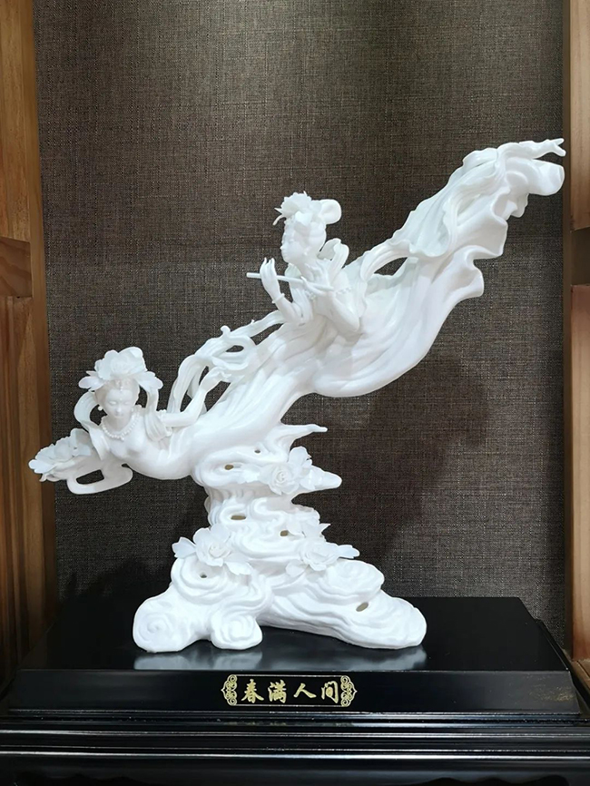 “飞行云中,神化轻举,以为天仙,亦云飞仙”。邱桂还的《春满人间》创作思路来源于敦煌壁画飞天。在传统瓷雕中,人物的塑造大部分以单体为主,该作品突破单体,传承并创新,以泥塑去表现人物的形与神。此飞仙悬浮凌空,衣裙飘曳,巾带飞舞,姿势自如优美,似凡尘中来。飞天落处,朵朵香花飘落,颇有"天花乱坠满虚空"的诗意。洛神是中国先秦神话中,司掌洛河的地方水神。洛神作为理想美神的化身,喻指美丽的爱情、靓丽的青春、美好的生活。陈碧珍的《洛神》优选颜色釉,巧妙运用亮丽丰富的色彩绘制婀娜多姿的洛神。以优美抽象的曲线,与圆盘完美结合,相映成趣。其构图饱满,虚实得当,笔法丰富,简洁洒脱,富有美感
