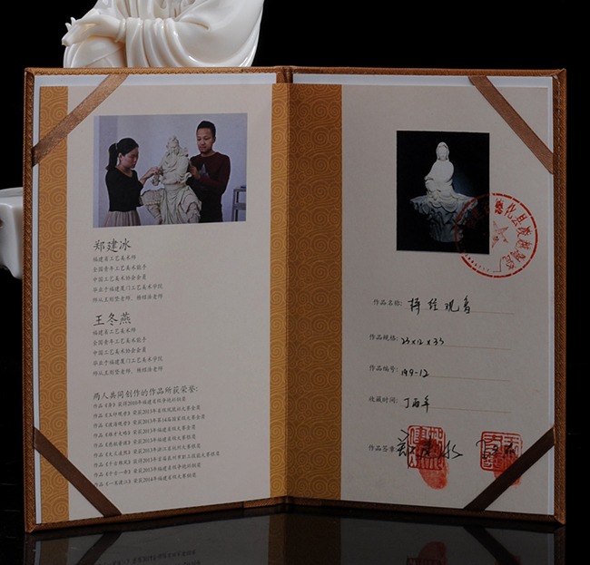 《持经观音》由福建省陶瓷艺术大师郑建冰设计创作。作品以德化温润如玉的 “中国白”为胎质,经1300多度高温烧制,胎体温润如玉。作品观音面容饱满,神情刻画,逼真自然,匠心造像,手持经书,衣纹线条柔美,流畅自然,形象塑造,生动自然,精雕细刻,栩栩如生。观音慈悲之相,宛然可见。作品落有大师个人签名及印章落款,兼具审美价值和收藏价值,是不可多得的雅作。是办公、家居、书房装饰摆设、礼赠、收藏的好选择。