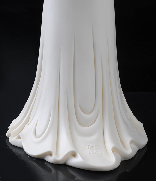 《悠然》由福建省陶瓷技术能手王桂兰设计创作。作品以德化温润如玉的 “中国白”为胎质,作品塑造知性唯美,温柔优雅,尽显古典美。匠心打造,神情刻画,逼真自然,姿态温婉,手持花篮,片片花瓣均为手工捏制,技艺精湛,衣纹线条柔美自然,翻转自然,细致雕琢。