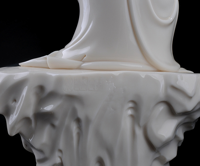 《持经观音》由福建省陶瓷艺术大师郑建冰设计创作。作品以德化温润如玉的 “中国白”为胎质,经1300多度高温烧制,胎体温润如玉。作品观音面容饱满,神情刻画,逼真自然,匠心造像,手持经书,衣纹线条柔美,流畅自然,形象塑造,生动自然,精雕细刻,栩栩如生。观音慈悲之相,宛然可见。作品落有大师个人签名及印章落款,兼具审美价值和收藏价值,是不可多得的雅作。是办公、家居、书房装饰摆设、礼赠、收藏的好选择。