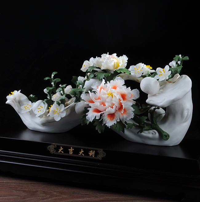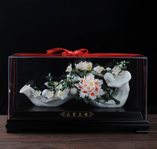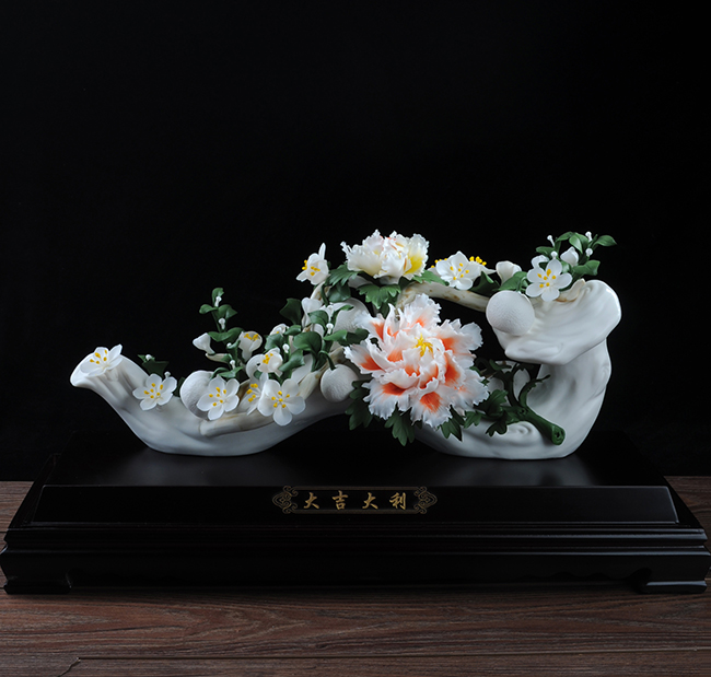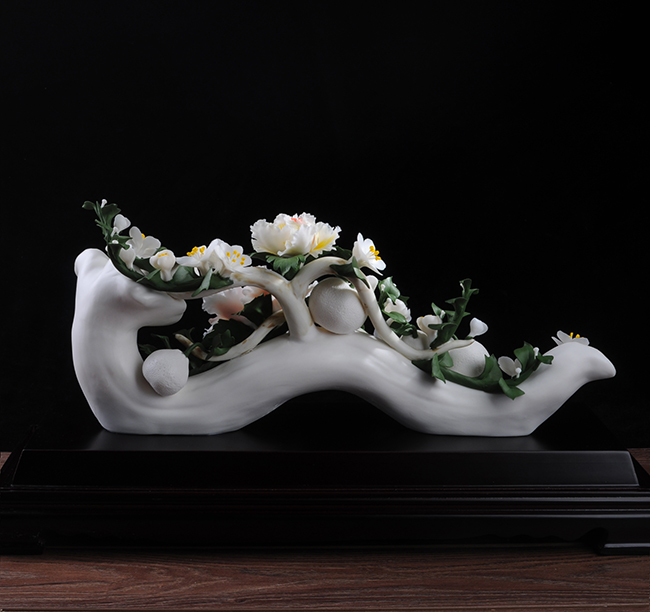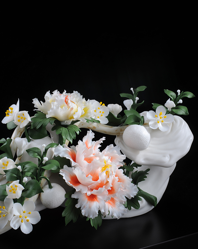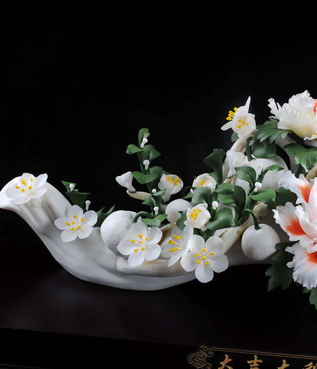 作品是采用高岭土为制作材料,经过原料研磨拌浆-滤泥-塑型-成型-晾干-素烧施釉-釉烧等多道工艺制作流程,最终形成一件美轮美奂的瓷艺术作品。形象逼真地再生再现了牡丹花、梅花、如意枝干,的形态、神韵、色彩和特殊寓意,立体陶瓷造型真实感强,巧夺天工, 绿叶将牡丹、梅花、橘子如意衬托相得益彰。