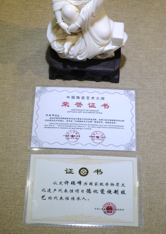 自幼随父亲许兴泰(中国工艺美术大师、中国陶瓷艺术大师)学艺,在继承德化历代瓷塑技艺尤其是家族传统技艺的基础上,致力于艺术创新与手法创新,在“瓷圣”何朝宗的写意概括与“山湖祖”精雕细琢的许氏家传技法之间找到了平衡点,创造出独树一帜的“许氏瓷塑”艺术风格。