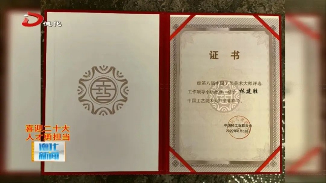 8月18日,第八届中国工艺美术大师颁证仪式在南京举行,我县新晋中国工艺美术大师林建胜在这一天拿到了这份沉甸甸的证书。