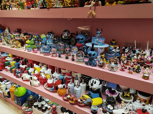 跨越300年的今天,顺美集团与迪士尼、星巴克、泡泡玛特等多家知名企业合作,设计生产著名IP陶瓷制品,产品远销海内外:深耕陶瓷摆件几十年来,拥有文创产品超十万件,花心血、斥巨资做这个展览馆,是希望让大家看到德化瓷器的国际魅力——德化白瓷是窗口,让世界看到德化陶瓷文化的同时,更看到中国制造的起飞与繁荣。