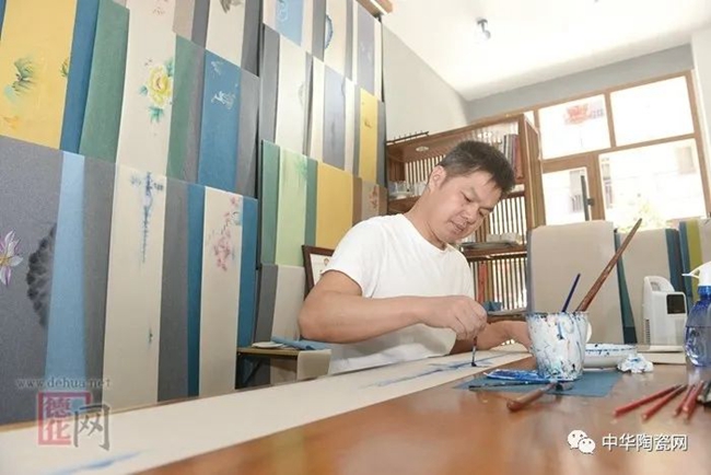 练志贵从厦门到德化创业已7年多,从事茶席文创,现在把家安在茶具城二期,工作室名叫“蓝桥雅室”,日常就是在茶席布上画画,挺享受这样安逸的生活。他介绍说,德化从事类似工作的有四五家,另外有不少企业制作布包布袋茶巾等,为茶室锦上添花。