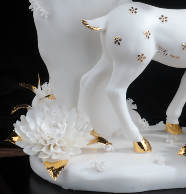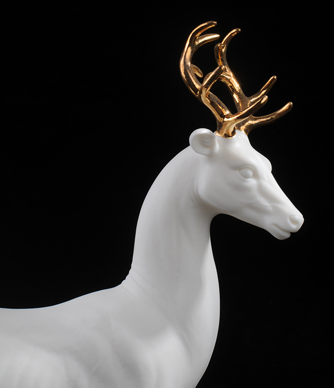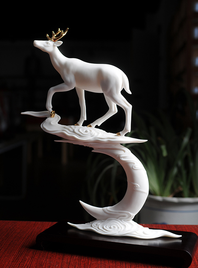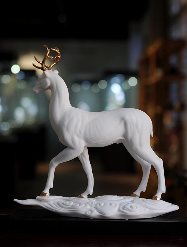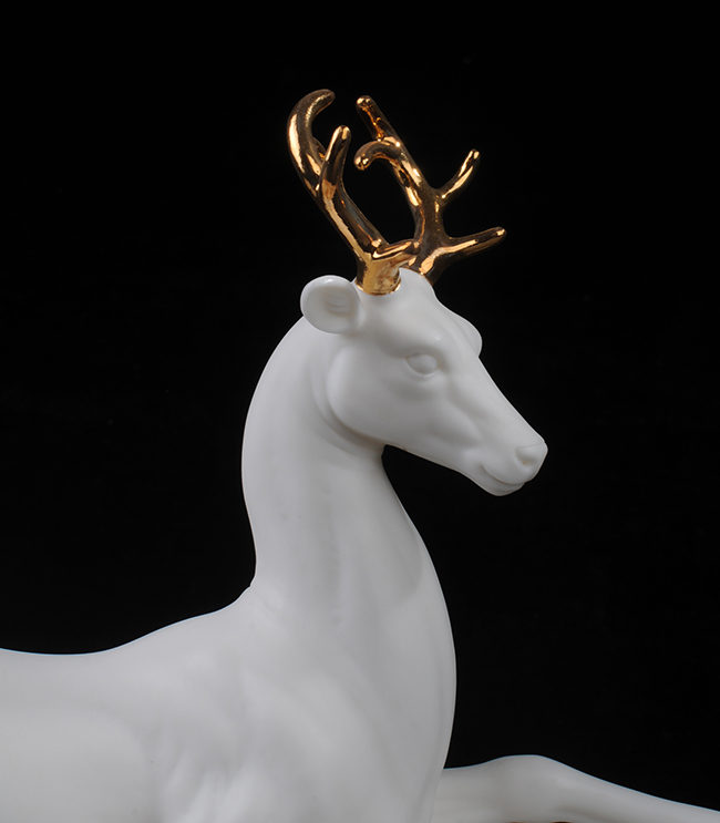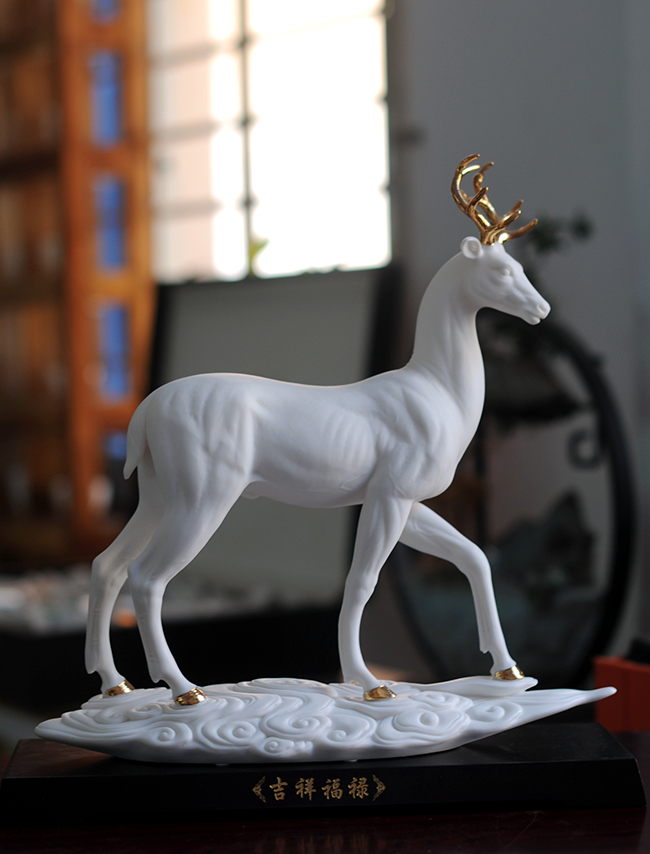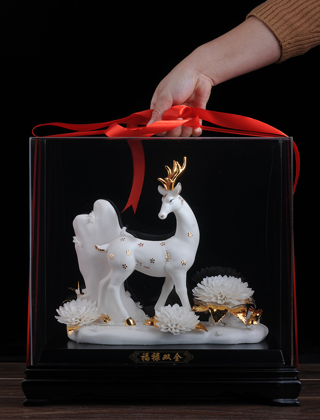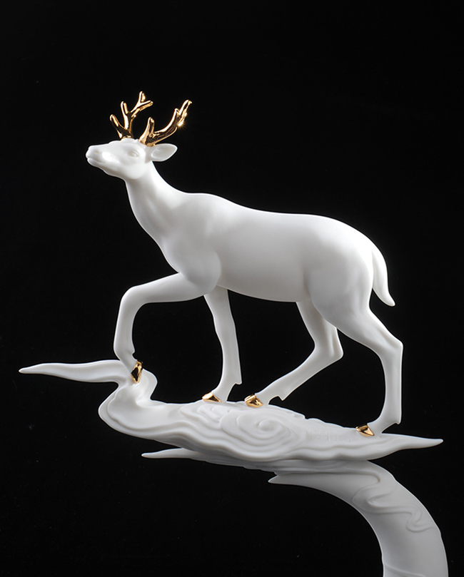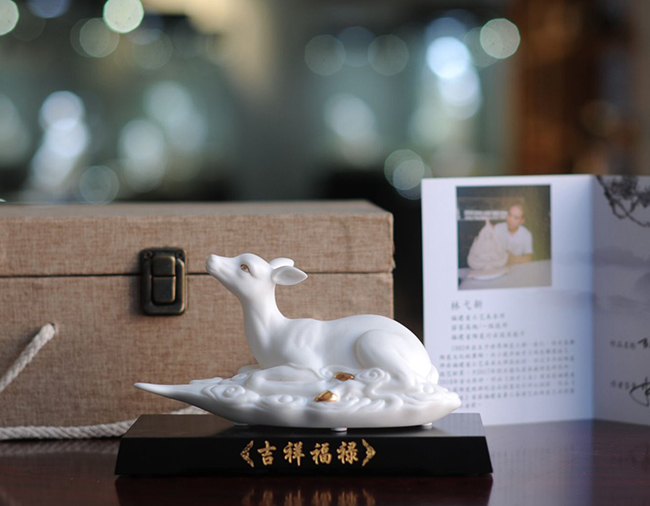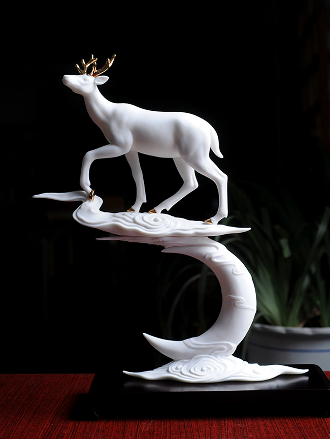 作品《福禄双全》鹿形饰物,“鹿”与“禄”同音。禄,古代称官吏的薪给为福禄,寓意财富,由高级工艺美术师手工打造,所塑鹿形态逼真,造型优美,以描金工艺体现作品高贵、以手工瓷花做为配饰,使作品更精细,并富有现代家居装饰美感,作品具有较高收藏价值及欣赏价值,是礼品、家居摆件、收藏的好选择。