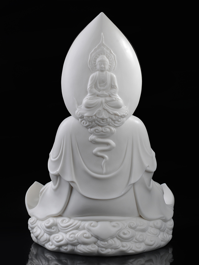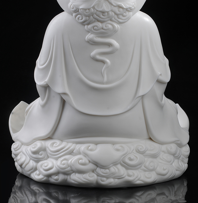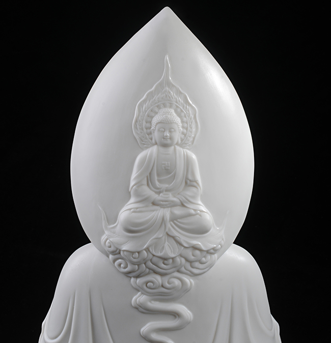 早在明代德化白瓷佛像就名声在外,一代“瓷圣”何朝宗佛像名作流传后世,成为世界各大博物馆收藏的珍品,更对佛像雕塑史上产生深远的影响,形成“何派”雕塑,其开创的捏、塑、雕、刻、刮、削、接、贴八字技法延用至今。何派观音雕塑注重于细节之美,精益求精,故而十分着意衣纹的刻画,使线条流畅,翻转自然。观其佛像,仿佛有春风拂面,衣袂飘扬的出尘之感。