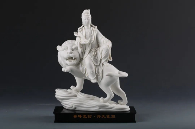 在国家级非遗传承人、许氏瓷塑第六代传人许瑞峰创办的泰峰瓷坊展厅内,陈列着各式各样精美的陶瓷艺术品。在展厅左侧展柜,记者见到一尊骑着一头狮子的菩萨,狮子四足直立,挺背抬头、双目仰望、表情威严,菩萨手持如意面目慈祥,双腿盘坐于狮背上的莲花座。“这是中国佛教四大菩萨之一的文殊菩萨,坐骑是一头青狮。”许瑞峰介绍,这是许氏瓷塑第三代传人许友义的作品,是许氏瓷塑有实物印证最早创作的“狮文化”作品。