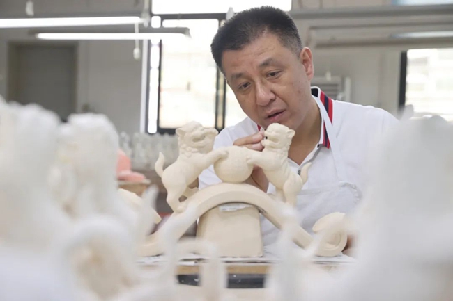 近日,在南京举行的第二届中国工艺美术博览会开幕式暨第八届中国工艺美术大师颁证仪式上,许瑞峰正式获颁“中国工艺美术大师”称号证书。作为工艺美术行业人才的最高荣誉,中国工艺美术大师评选始于1979年,至今共进行了八届评选,德化先后有8人获此殊荣。其中,许瑞峰的父亲许兴泰于1993年获第三届“中国工艺美术大师”称号,也是福建省陶瓷界第一个获此荣誉的瓷雕大师。而这种父子先后获“国大师”称号的佳话,在工艺美术界并不多见,足见其家学渊源与技艺的优良传承。而许氏瓷塑几代人创作“狮文化”作品,正是中华民族传统文化与非遗技艺传承的完美诠释和缩影。如今,许氏瓷塑已传承至第七代——许瑞峰的儿子许启元。出生于1993年的许启元在浓厚的艺术氛围中成长,又于西安美术学院雕塑系系统化地学习传统与当代雕塑基础。