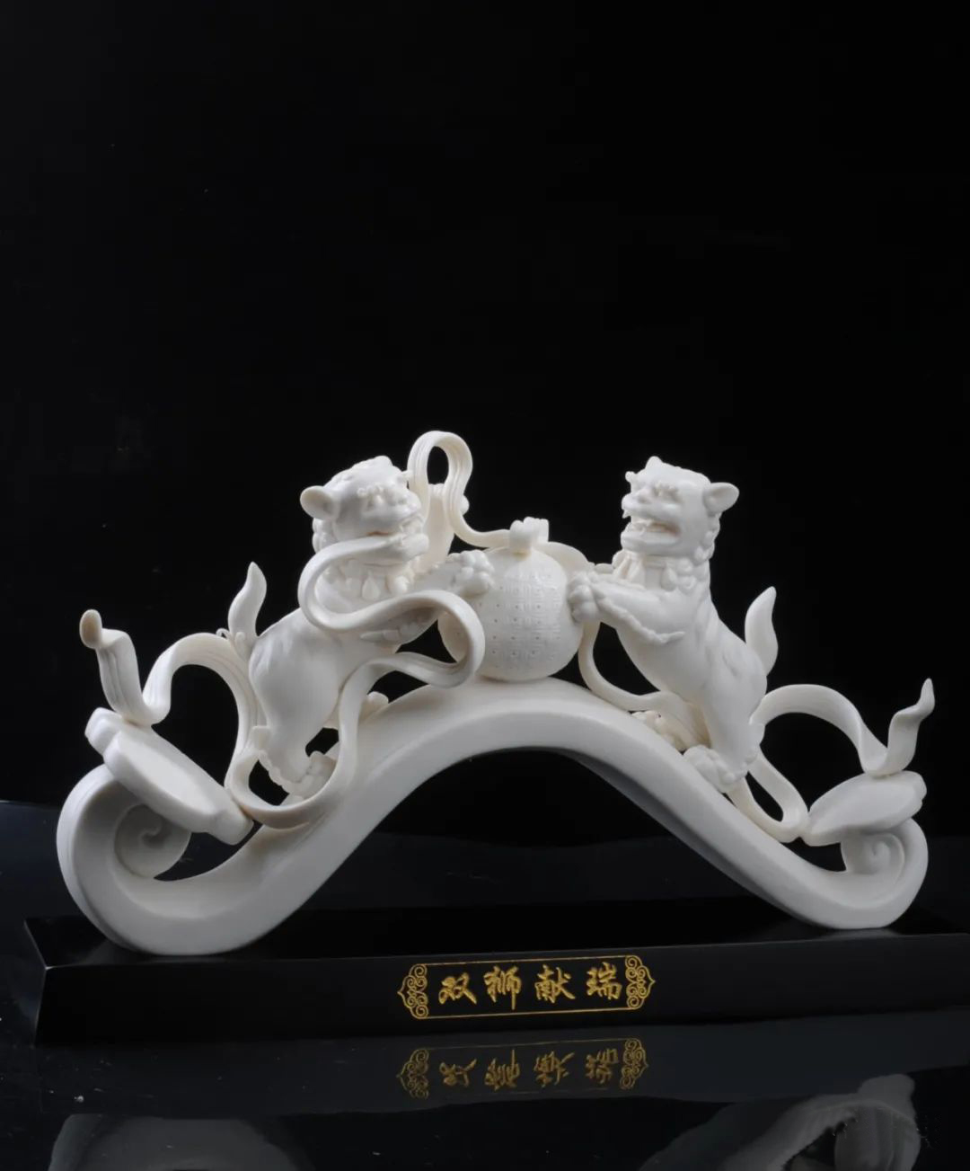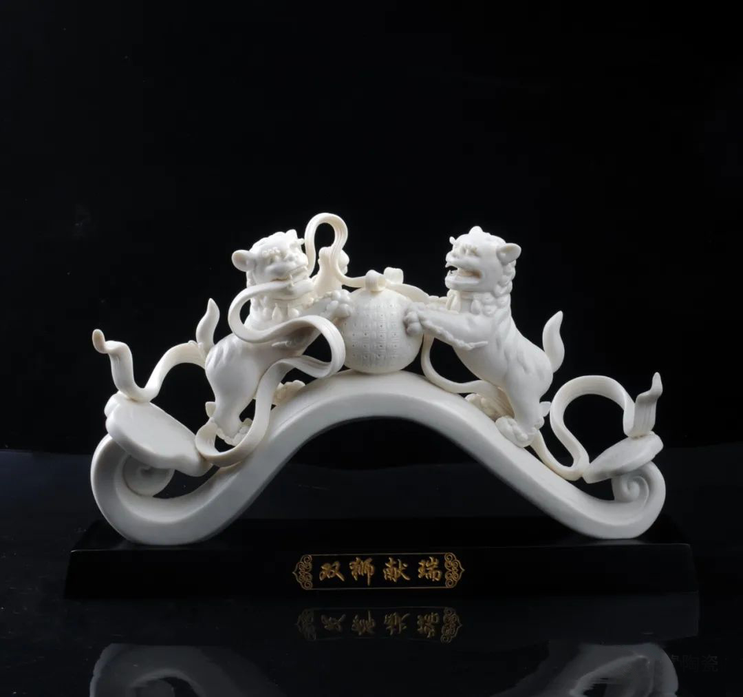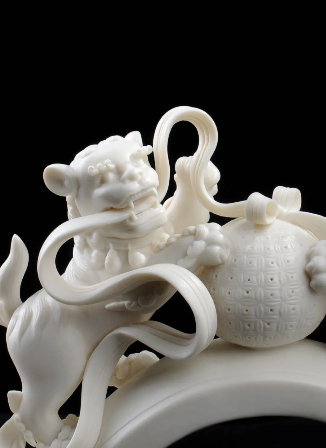 一件成功的雕塑作品,最大的难点在于创意及表现形式。“我本来只打算单纯做一对双狮戏球的摆件,后来才突发奇想加了如意和飘带进去,使其有‘事事(狮狮)如意’的美好寓意,在形态上也更加灵动。”许瑞峰说,作品中狮子的配饰、铃铛、飘带、鬓毛等细节,能很好地表现德化陶瓷及许氏瓷塑的特色传统技法。创作过程中他不断挖掘“狮文化”内涵,同时借鉴了石雕、木雕、铜雕技法。铜钱状的绣球寓意财源滚滚,悬空的飘带透露出喜庆。