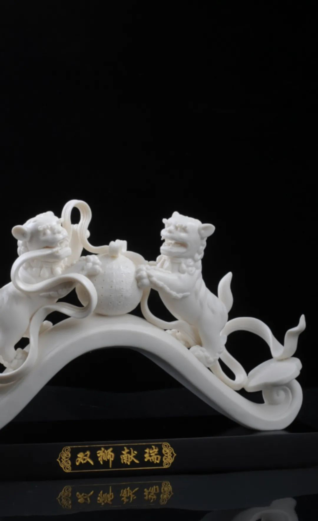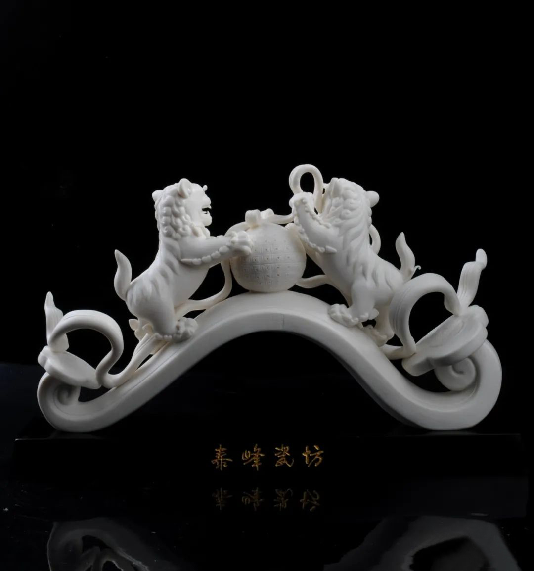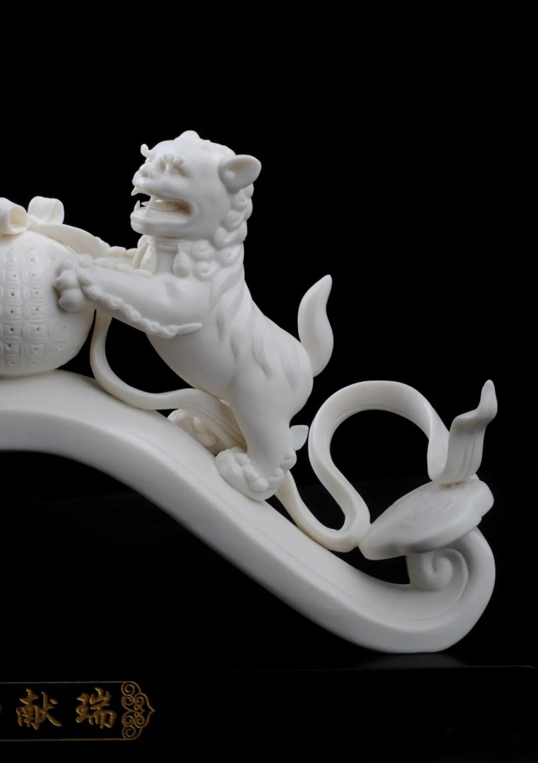 一件成功的雕塑作品,最大的难点在于创意及表现形式。“我本来只打算单纯做一对双狮戏球的摆件,后来才突发奇想加了如意和飘带进去,使其有‘事事(狮狮)如意’的美好寓意,在形态上也更加灵动。”许瑞峰说,作品中狮子的配饰、铃铛、飘带、鬓毛等细节,能很好地表现德化陶瓷及许氏瓷塑的特色传统技法。创作过程中他不断挖掘“狮文化”内涵,同时借鉴了石雕、木雕、铜雕技法。铜钱状的绣球寓意财源滚滚,悬空的飘带透露出喜庆。